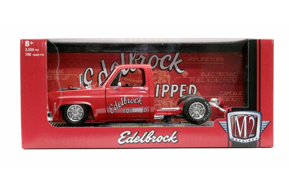 The second release in M2 Machines 1/24th scale Hobby series is a 1973 Chevrolet Cheyenne 10 skinned in Bright Red with White Edelbrock logos. This bedless Squarebody includes details such as a Bright Red painted custom chassis, custom turbo engine and rolls on Chrome 5-spoke wheels wrapped in Goodyear tyres.