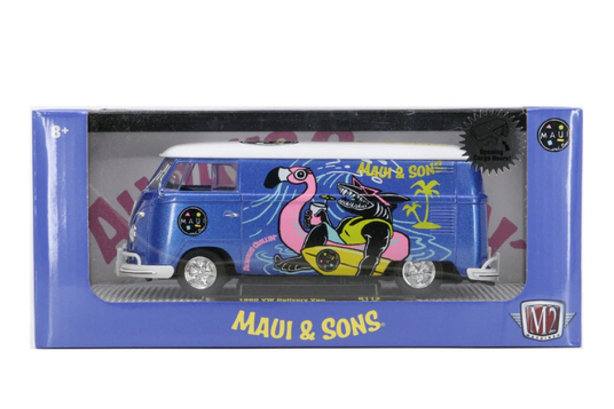 1960 VW Delivery Van themed around the Maui & Sons brand. Painted in a base coat of Blue Metallic with a White top, she is fully outfitted with Their “Always Chillin” graphics. A look inside the clear windows leads to a Gray delivery van interior. This bus rolls on a lowered chassis with Chrome VW specific 5-spoke wheels and black tyres at each corner.