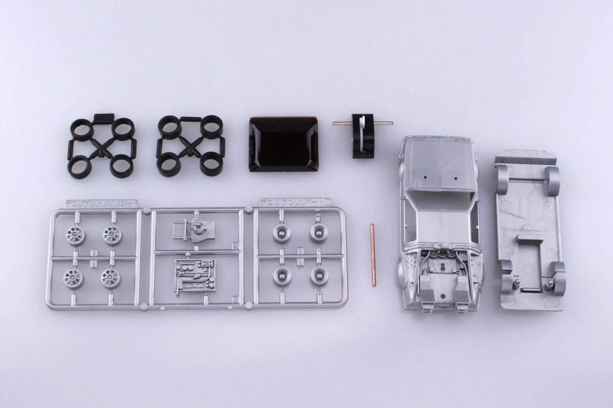 Plastic “Pullback” model kit by Aoshima. Includes two variations for the wheels (one is the Rail Road) – there’s only one car!