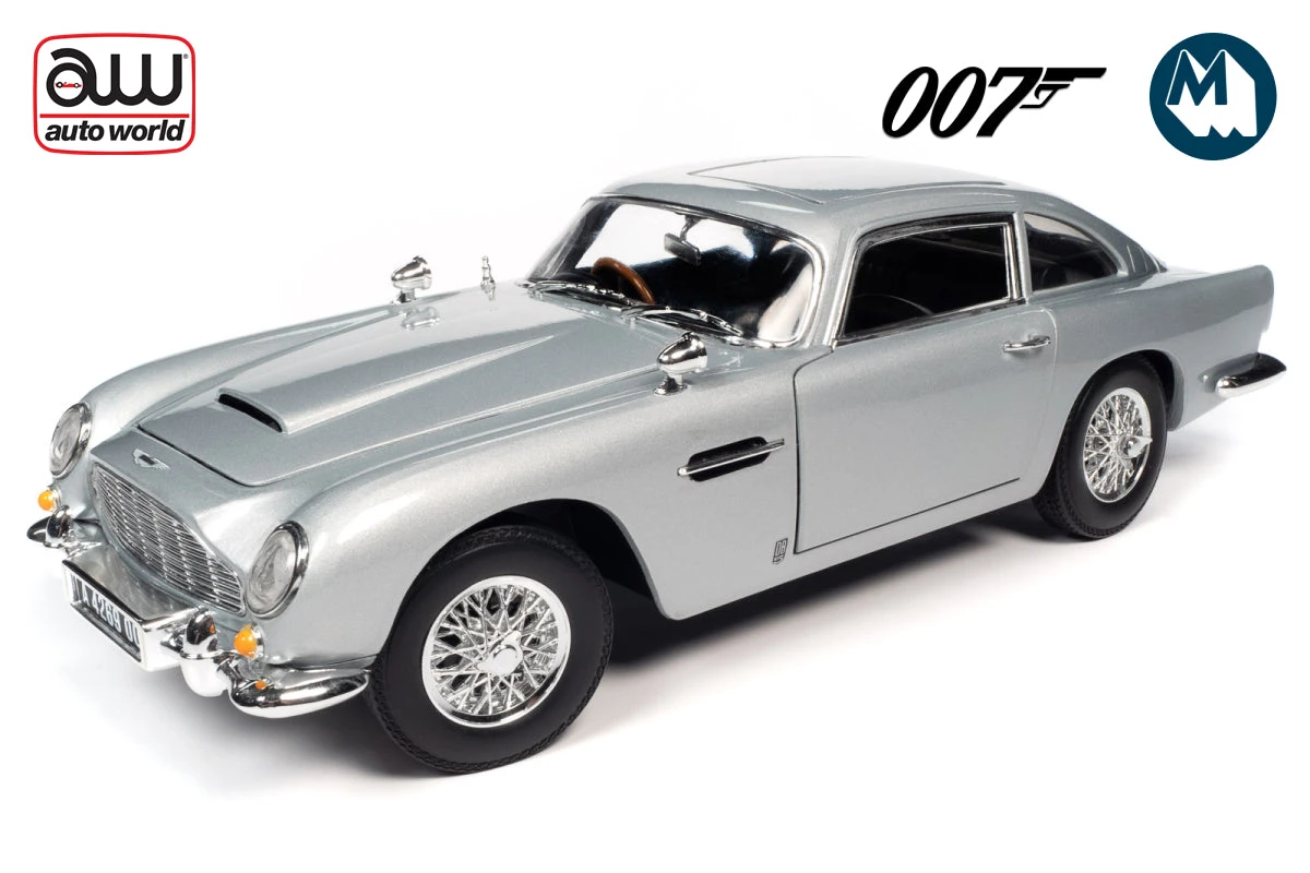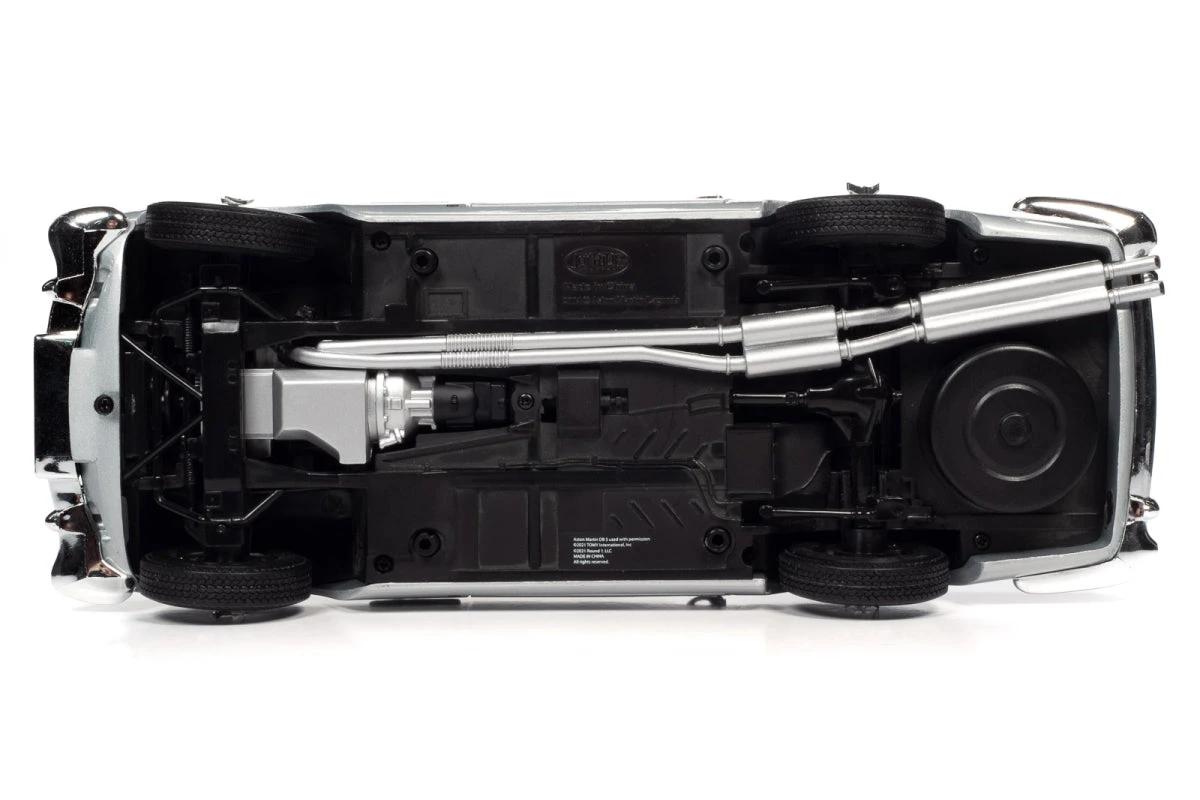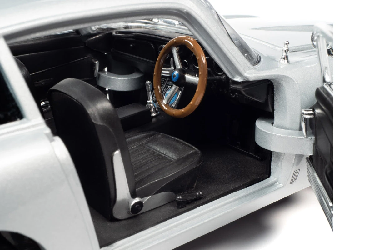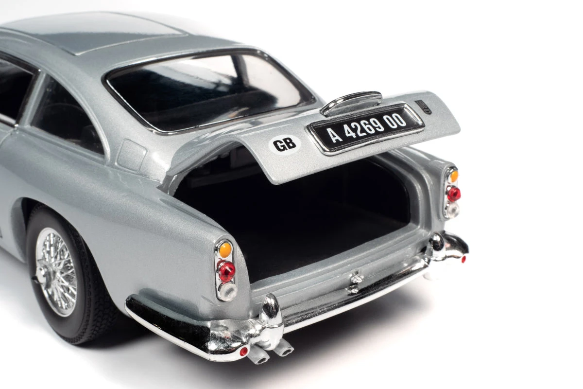 Originally from Goldfinger, the Aston Martin DB5 returned in No Time To Die with new plates and gadgets. This Auto World replica has silver birth exterior, a detailed engine, steerable front wheels, and accurate interior and chassis, opening doors, hood, trunk and 007’s “escape hatch” roof!