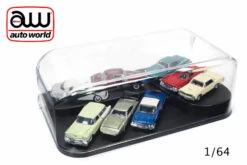 Auto World 3 in 1 display case fits nine 1:64 scale cars, three 1:43 cars or one 1:18 car. Also perfect for your own dioramas! Sleek acrylic design includes 3-step platform and hinged clear cover to keep the dust out!