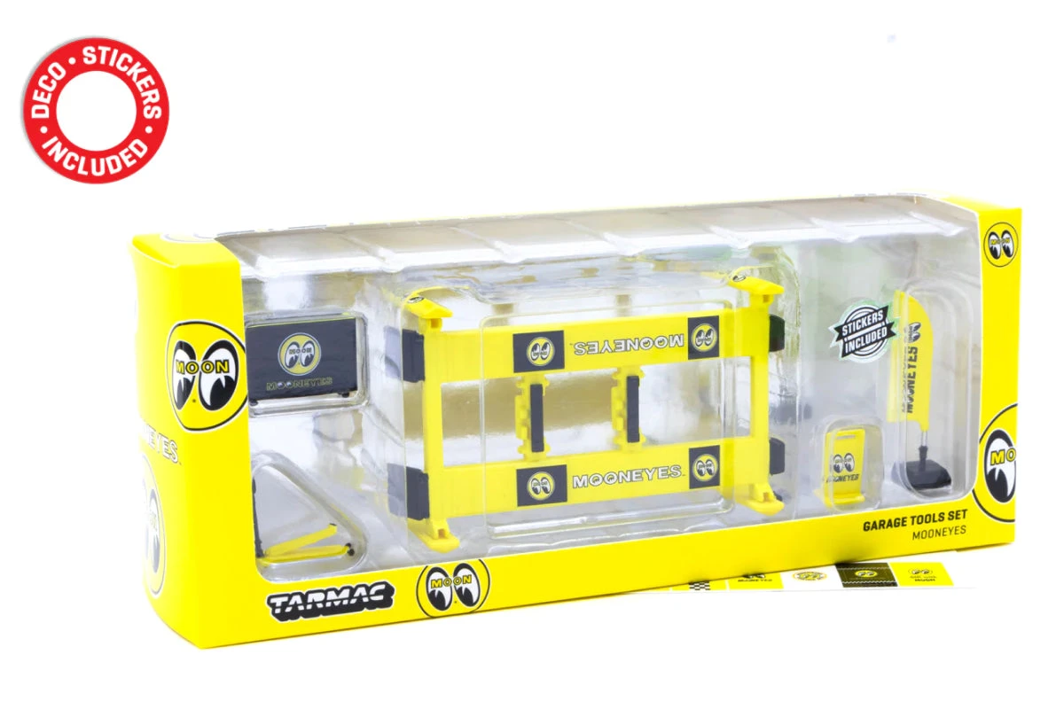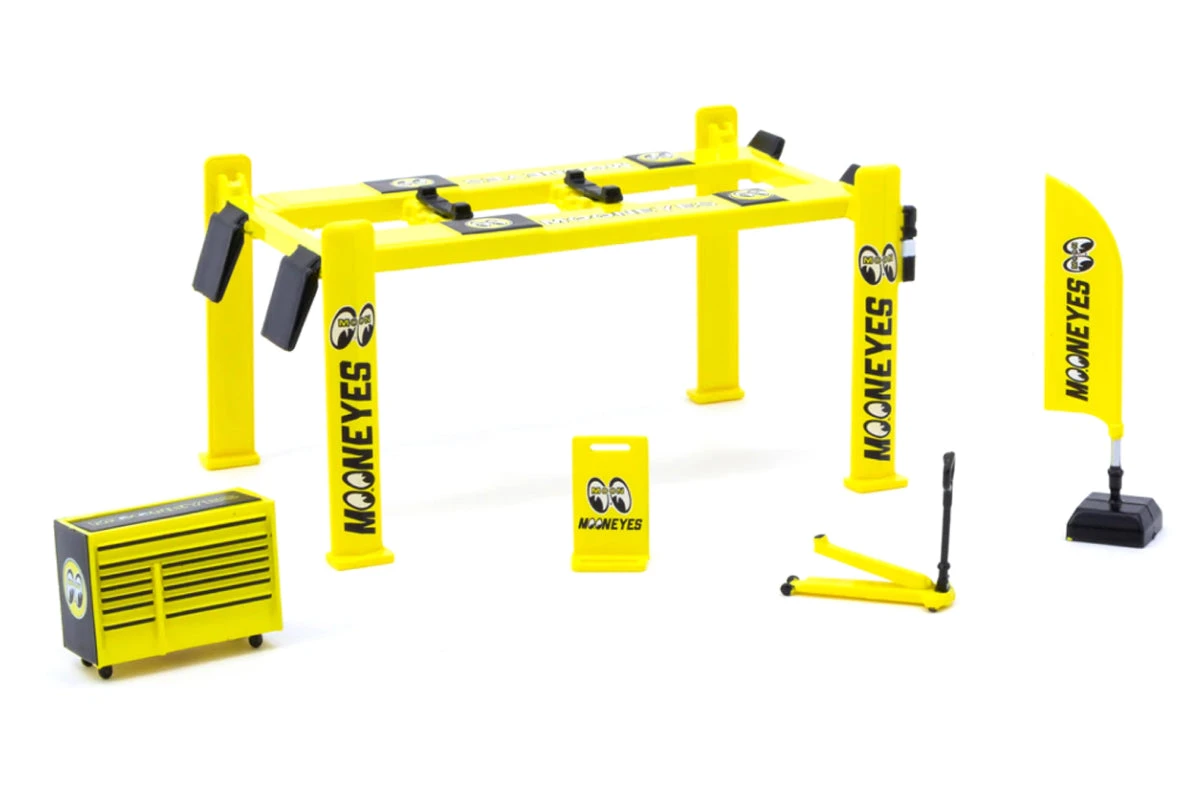 1:64 plastic garage tool sets by Tarmac Works. Includes four post lifts, tool box, trolley jack, pit sign, flag banner and 2 set of stickers. They also contain two sets of stickers.